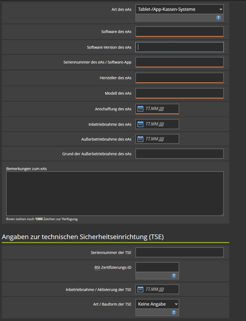 Bei Anmeldung einer Kasse noch nicht relevant. Erst bei Abmeldung dieser trägst du hier das Datum ein, ab dem das Gerät nicht mehr im Betrieb vorgehalten wird.